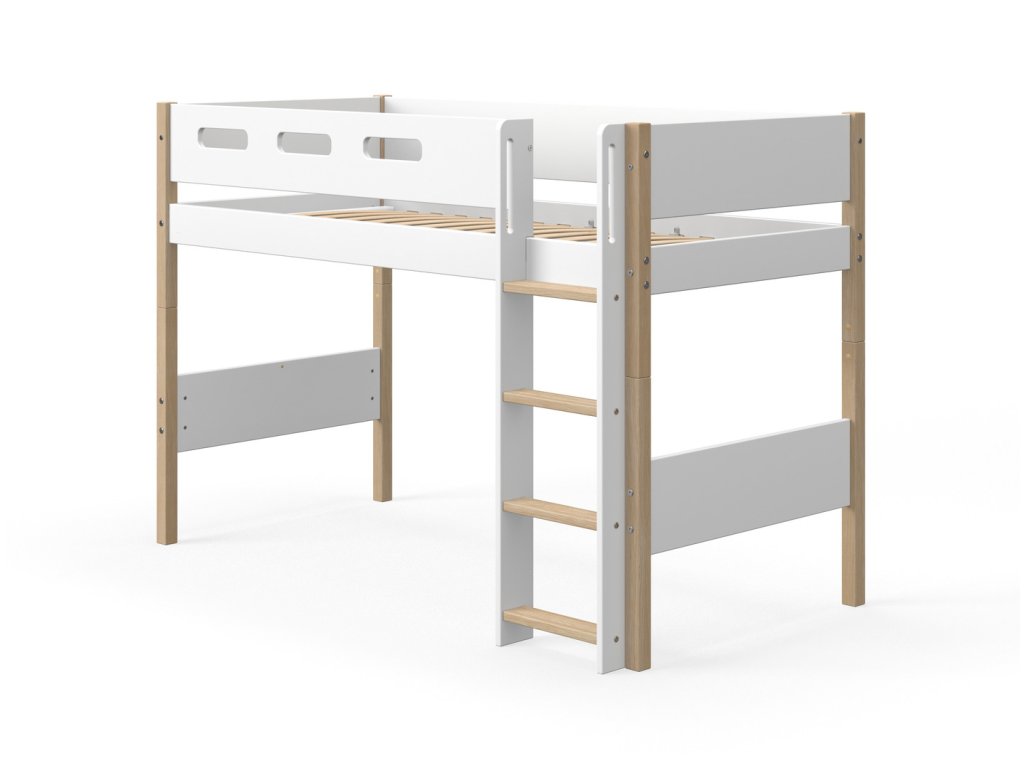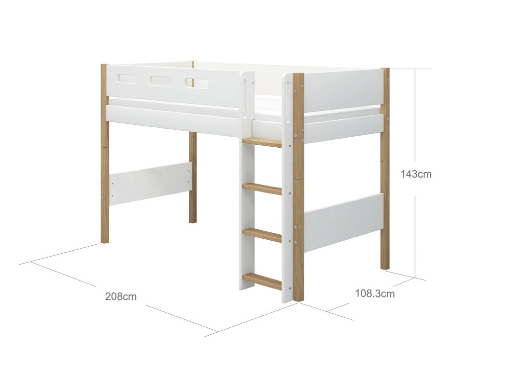 NOR polovysoká postel s rovným žebříkem pro starší dítě. Žebřík má protiskluzové schůdky a integrovaná madla a lze jej umístit na oba konce postele. Prostor pod polovysokou postelí je ideální pro uložení věcí. Je možné použít úložné prostory od POPSICLE nebo CABBY. Textilie FLEXA vám umožní vytvořit pod postelí domeček přidáním hracích závěsů s nástavci. Kolekce NOR roste s dětmi. K polovysoké posteli přidejte krátké nohy a postel můžete přestavět na zvýšené jednolůžko. Sundáním nohou máte standardní jednolůžko. Nebo přidejte k posteli vysoké nohy a přestavte polovysokou postel na vysokou postel. Postel je vyrobena z vysoce kvalitní MDF a má nohy z masivního dubu. Doporučený věk: Od 6 let.