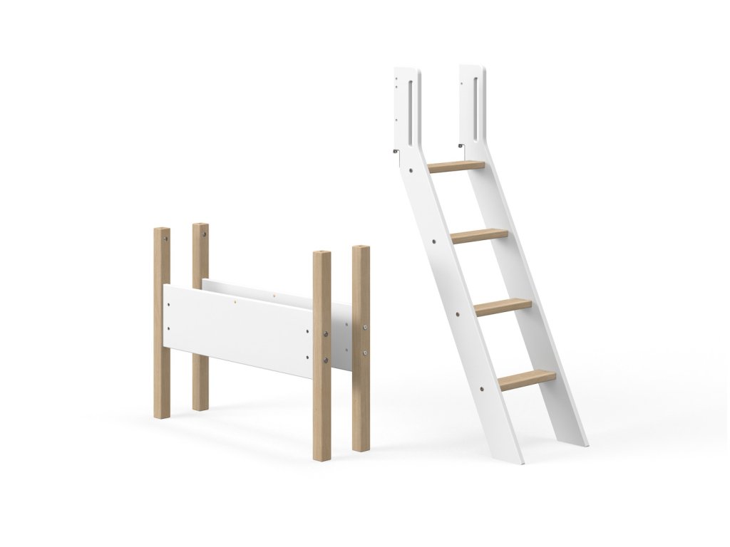 K jednolůžku NOR přidejte šikmý žebřík a nohy a proměňte postel v polovysokou postel. Žebřík má protiskluzové schůdky a integrovaná madla. Žebřík a nohy jsou vyrobeny z MDF a masivního dubu.