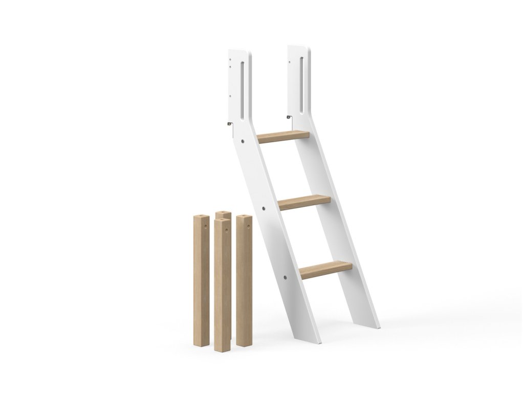 Šikmý žebřík a střední díly pro středně vysokou postel NOR. Žebřík má protiskluzové schůdky a integrovaná madla. Žebřík je vyroben z MDF a masivního dubu.