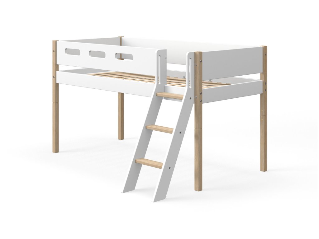 NOR středně vysoká postel se šikmým žebříkem a bezpečnostní zábranou pro děti. Žebřík má protiskluzové schůdky a integrovaná madla a lze jej umístit na oba konce postele. Prostor pod středně vysokou postelí je ideální pro uložení věcí a můžete jej zkombinovat s úložným prostorem z kolekce POPSICLE nebo CABBY. Textilie FLEXA vám umožní vytvořit pod postelí domeček přidáním hracích závěsů. Na lůžku lze použít jeskyni. Výměnou bezpečnostní zábrany a přidáním skluzavky k posteli se dětský pokoj promění v hřiště. Kolekce NOR roste s dětmi. Sundáním krátkých nohou ke středně vysoké posteli můžete postel přestavět na jednolůžko. A přidáním vysokých nohou k posteli můžete postel přestavět na vysokou postel. Postel je vyrobena z vysoce kvalitní MDF a má nohy z masivního dubu. Doporučený věk:od 6 let