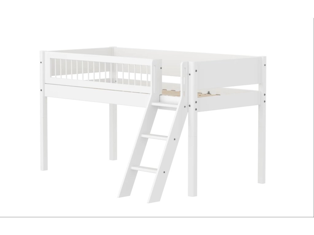 Postel se šikmým žebříkem a bezpečnostní zábranou pro děti. Žebřík má protiskluzové schůdky a integrovaná madla a lze jej umístit do obou konců postele. Prostor pod lůžkem je ideální pro ukládání. Textilie FLEXA vám umožní vytvořit soukromí pod postelí přidáním hracích závěsů. Výměnou bezpečnostní zábrany a přidáním skluzavky k posteli se dětský pokoj promění v hřiště. Přidáním krátkých nohou ke střední vysoké posteli můžete postel přestavět na jednolůžko. A přidáním vysokých nohou k posteli můžete postel přestavět na vysokou postel. Bezpečnostní zábrana je k dispozici ve třech různých barvách. Postel je vyrobena z vysoce kvalitního MDF a má nohy z masivní břízy. Doporučený věk: Od 6 let.