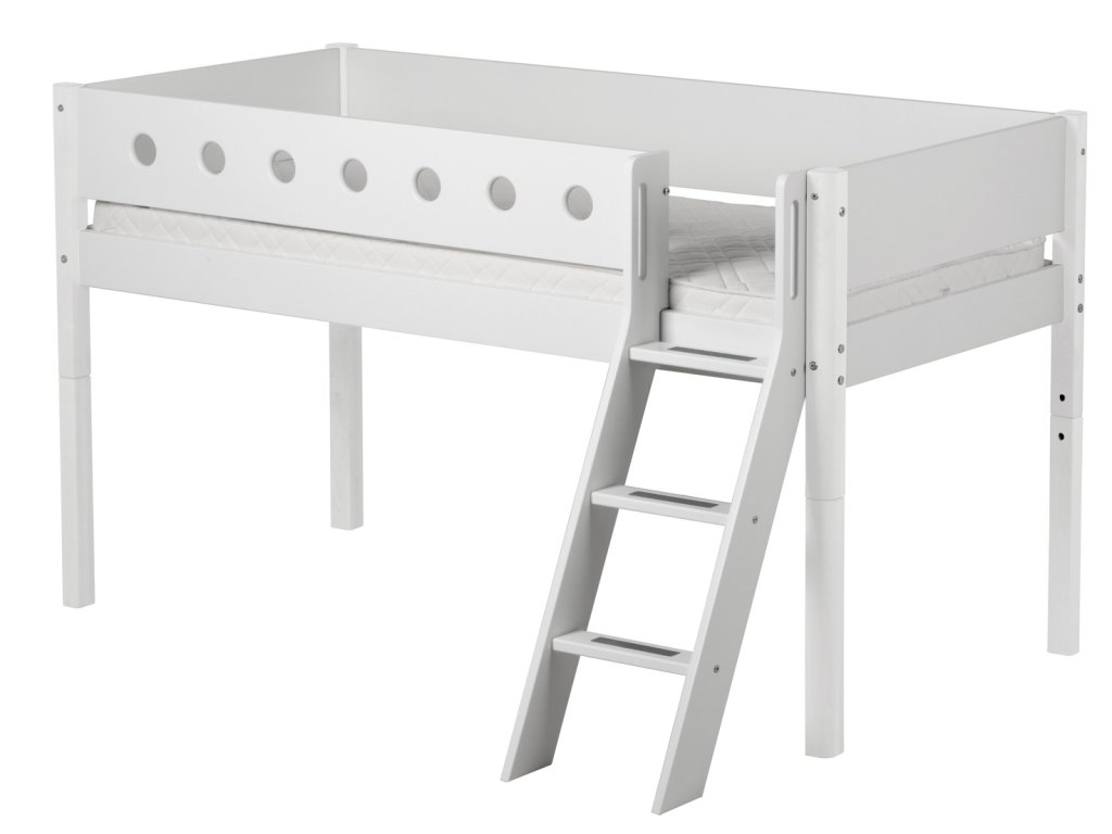 Postel se šikmým žebříkem a bezpečnostní zábranou pro děti. Žebřík má protiskluzové schůdky a integrovaná madla a lze jej umístit do obou konců postele. Prostor pod lůžkem je ideální pro ukládání. Textilie FLEXA vám umožní vytvořit soukromí pod postelí přidáním hracích závěsů. Výměnou bezpečnostní zábrany a přidáním skluzavky k posteli se dětský pokoj promění v hřiště. Přidáním krátkých nohou ke střední vysoké posteli můžete postel přestavět na jednolůžko. A přidáním vysokých nohou k posteli můžete postel přestavět na vysokou postel. Bezpečnostní zábrana je k dispozici ve třech různých barvách. Postel je vyrobena z vysoce kvalitního MDF a má nohy z masivní břízy. Doporučený věk: Od 6 let.